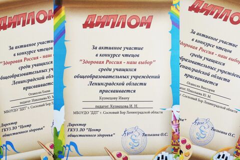 C 20 апреля по 23 мая обучающиеся детских объединений "Мультстудия "Веселый лучик" (педагог: Кузнецова Ирина Николаевна), "МАИ" (педагог: Николаева Юлия Михайловна) приняли участие в конкурсе стихов "Здоровая Россия - наш выбор" среди учащихся общеобразовательных учреждений Ленинградской области.