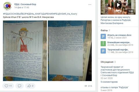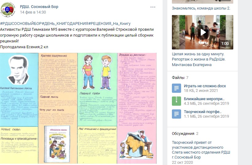 14 февраля - Всемирный День Книгодарения. В честь этого события местное отделение РДШ города Сосновый Бор провело конкурс на лучшую рецензию на книгу. Участникам конкурса предлагалось прислать рецензию на недавно прочитанную книгу, обязательно с иллюстрацией.
