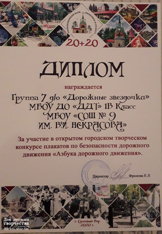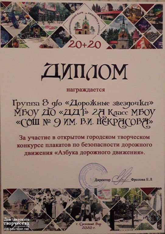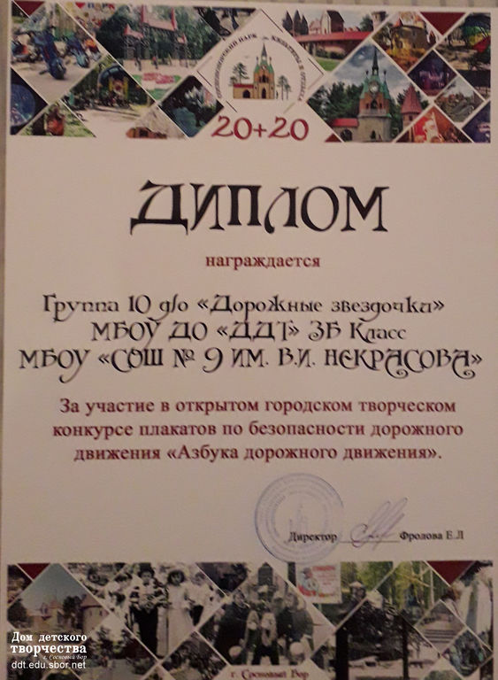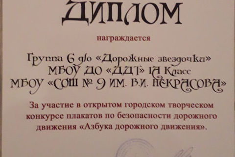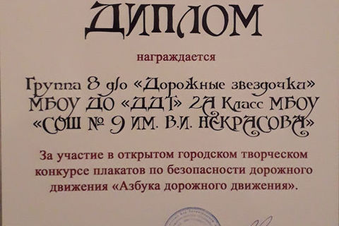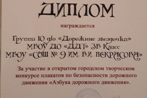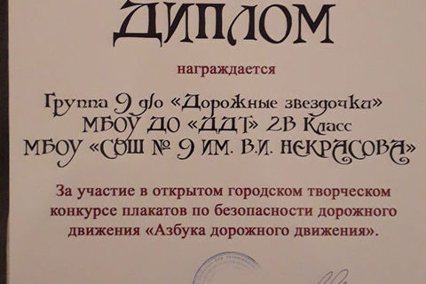 В сентябре - октябре 2020 года обучающиеся детское объединение "Дорожные звездочки", учащиеся 1-3 классов МБОУ "СОШ №9 им. В. И. Некрасова (педагог: Копылова Мария Андреевна) приняли участие в открытом городском творческом конкурсе плакатов по безопасности дорожного движения «Азбука дорожного движения».