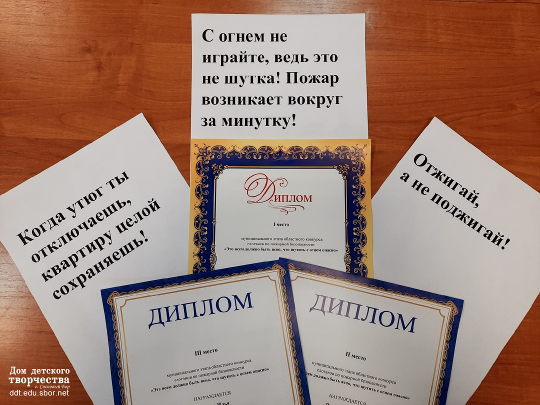 - 1 место: Цветкова Анастасия, МБОУ «Гимназия №5», педагог: Макаренко Ольга Алексеевна, слоган: «С огнем не играйте, ведь это не шутка! Пожар возникает вокруг за минутку!».