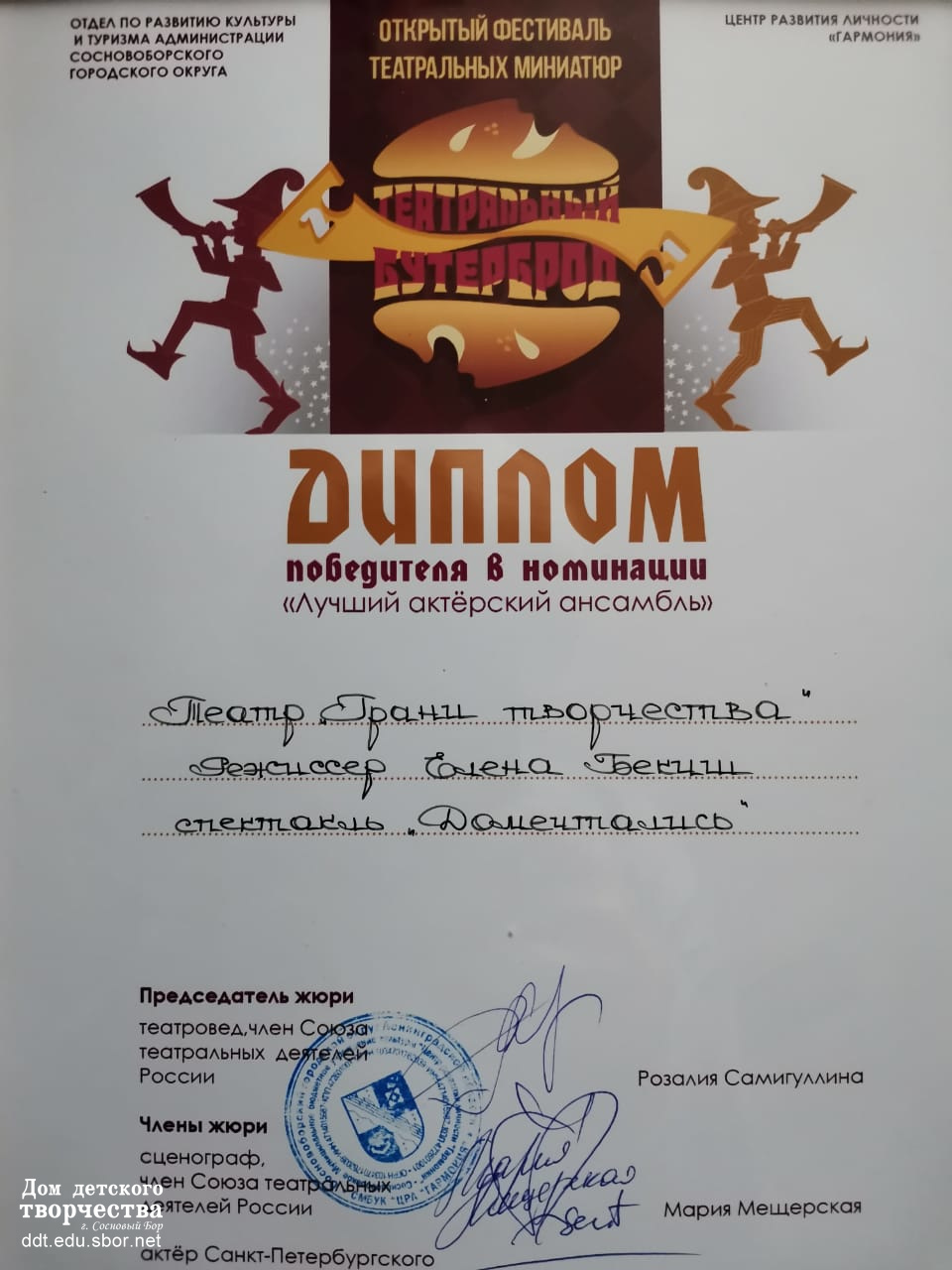 27 марта детское объединение «Грани творчества» (педагог Елена Аркадьевна Бекиш) приняли участие в Открытом фестивале театральных миниатюр «Театральный бутерброд», который проходил в Центре развития личности «Гармония». Ребята показали спектакль "Домечтались". На фестивале выступали коллективы из Соснового Бора и Санкт-Петербурга. Каждый представленный спектакль оценивало профессиональное жюри.