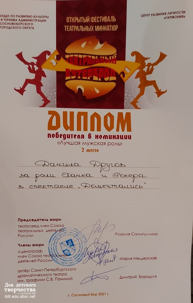- Диплом победителя 2 место Другов Данила в номинации «За лучшую мужскую роль»;