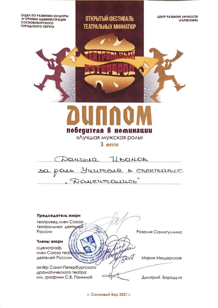 - Диплом победителя 3 место Иванов Даниил в номинации «За лучшую мужскую роль»;