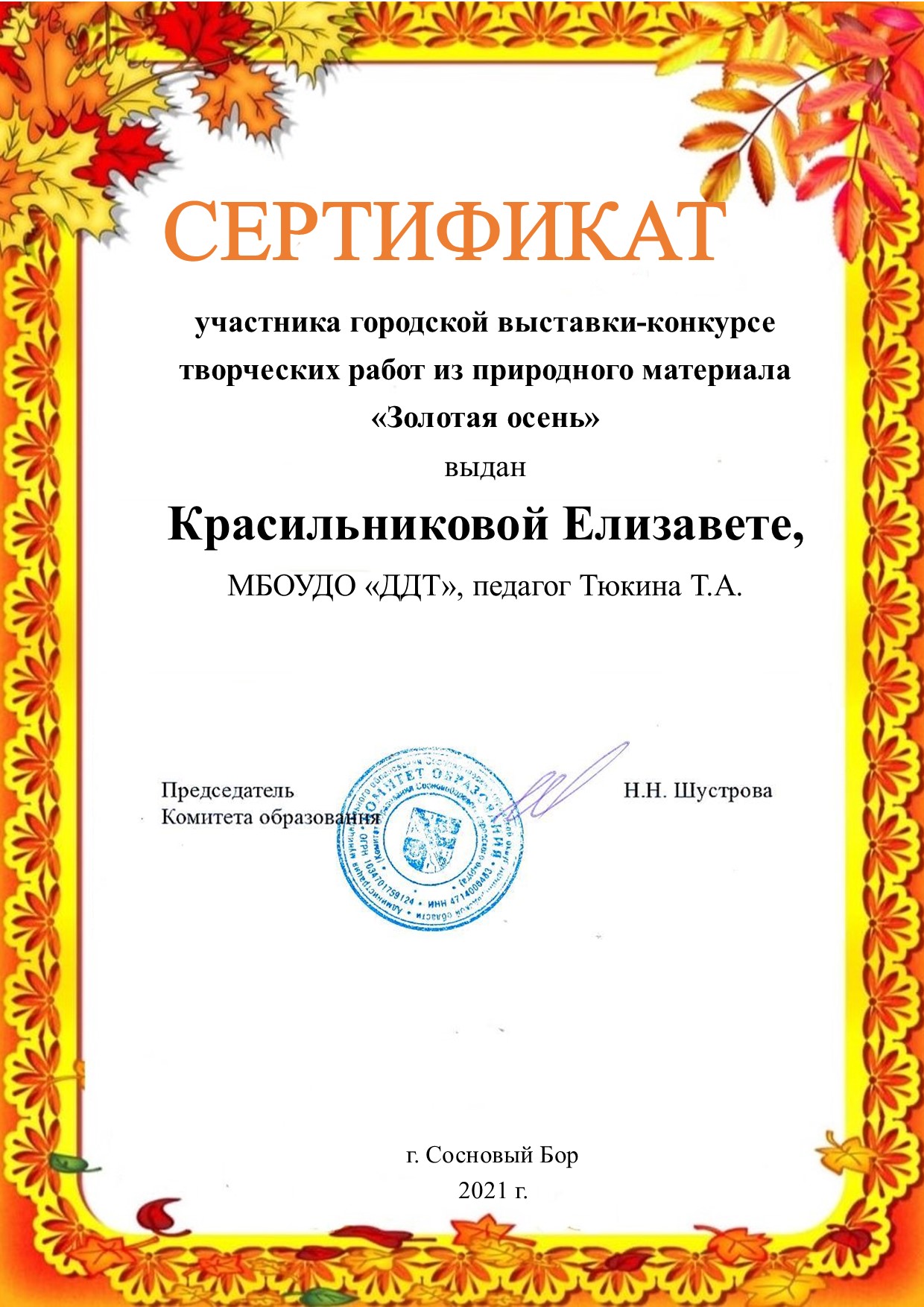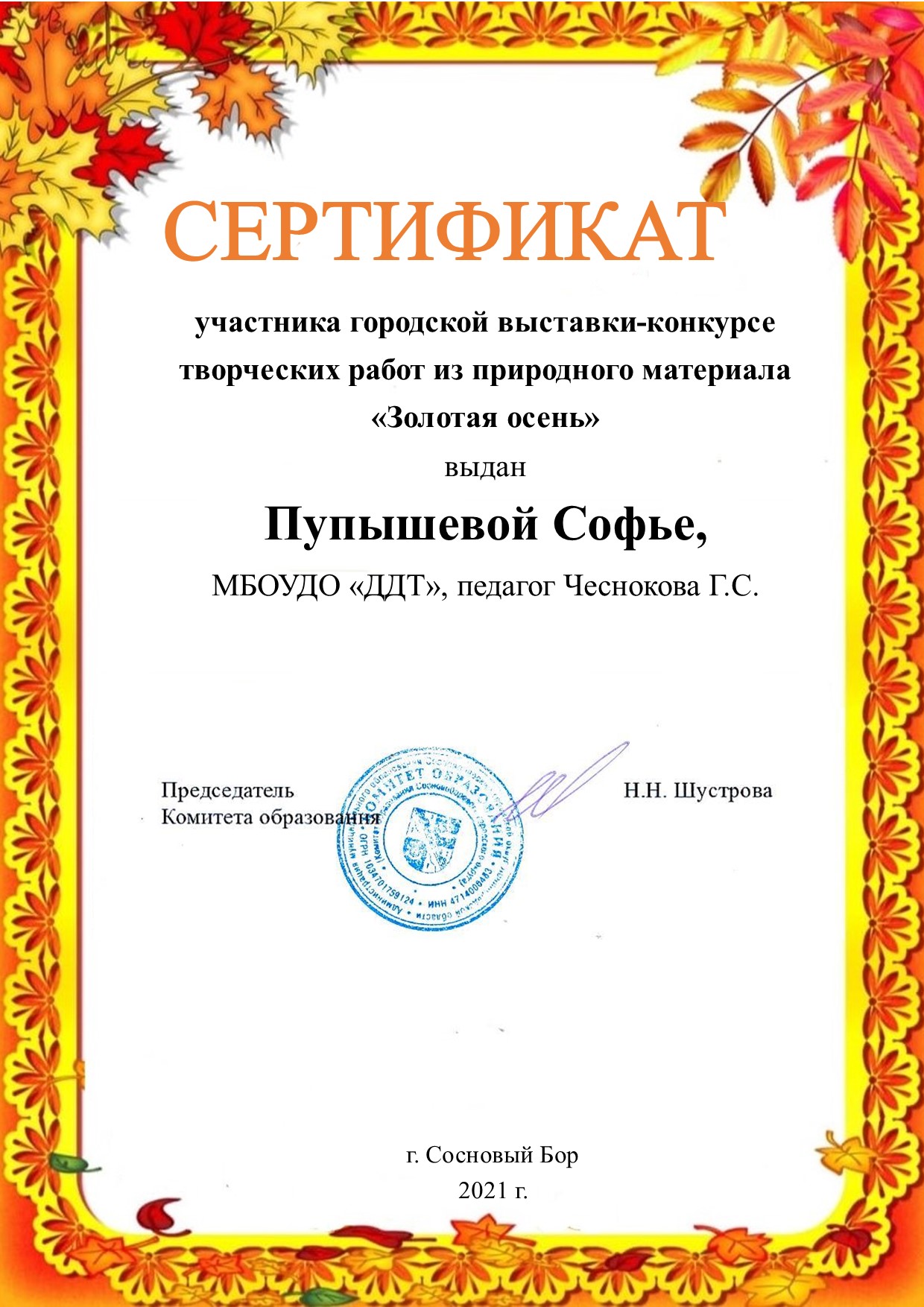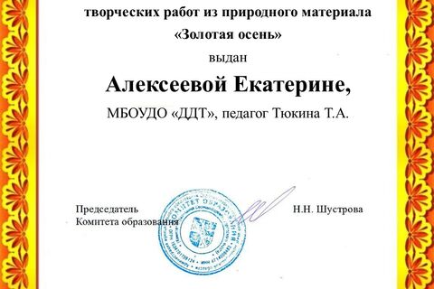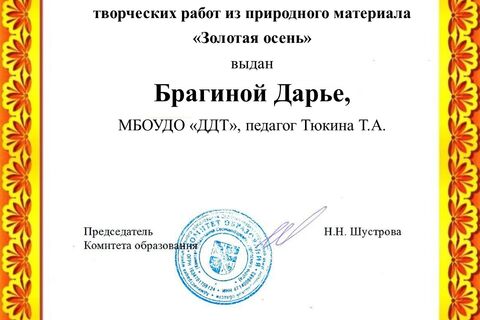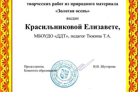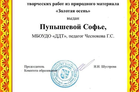 - Сертификат: Кунаева Екатерина, Пупышева Софья, Солодышев Даниил, детское объединение «Золотой ключик», педагог: Чеснокова Галина Сергеевна.