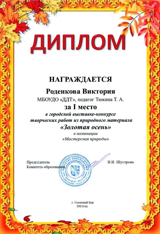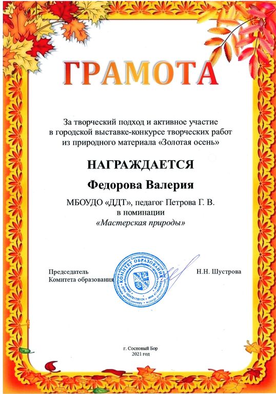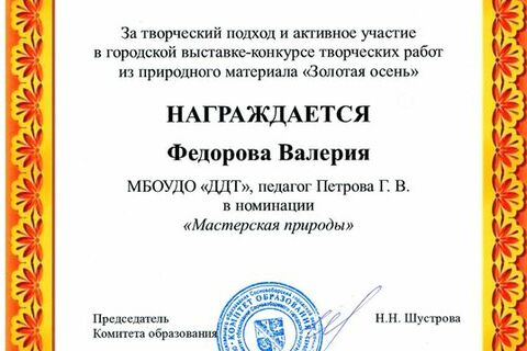 - Грамота – Федорова Валерия, детское объединение «Природа и фантазия», педагог: Петрова Галина Васильевна.