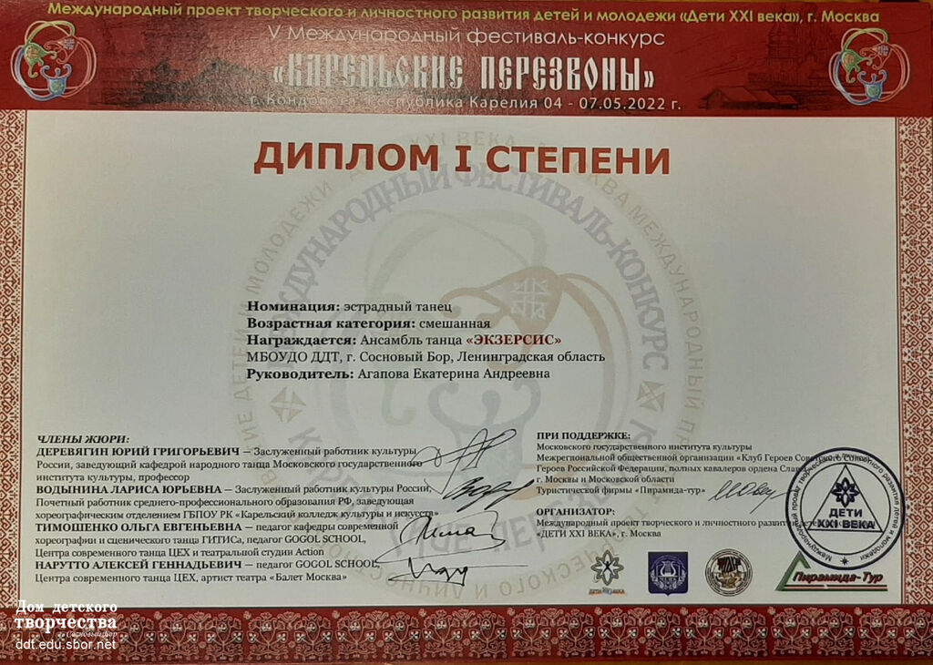 C 3 мая по 6 мая хореографические ансамбли "Экзерсис", "Непоседы" (педагог: Агапова Екатерина Андреевна) приняли участие в V Международном конкурсе-фестивале "Карельские перезвоны" в рамках Международного проекта творческого и личностного развития детей и молодёжи «ДЕТИ XXI ВЕКА» Республика Карелия.