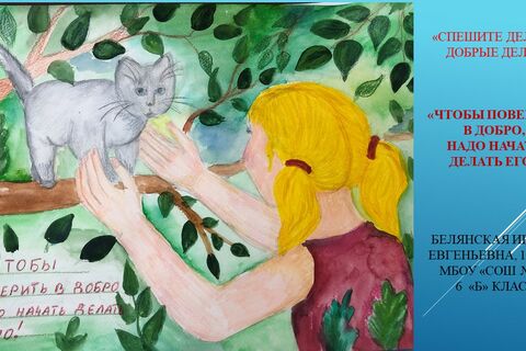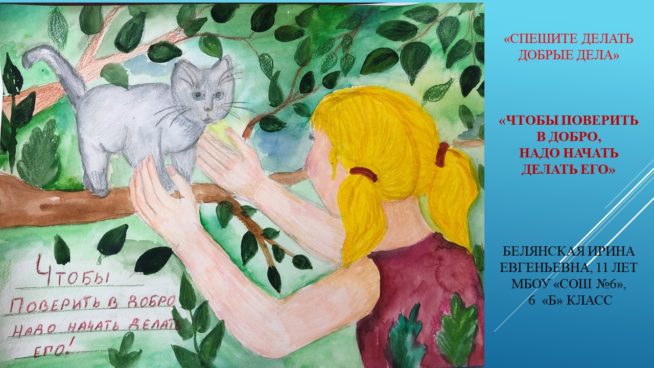 - Призер: Белянская Ирина, МБОУ "СОШ №6", педагог: Гамзаева Разият Абдуллаевна, работа: "Чтобы поверить в добро, надо начать делать его!";