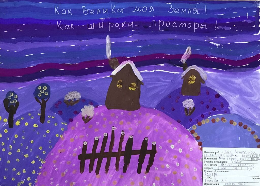 - Призер: Мосина Екатерина, МБОУДО "ДДТ", педагог: Лютова Ирина Николаевна, работа "Как велика наша земля, как широки просторы";