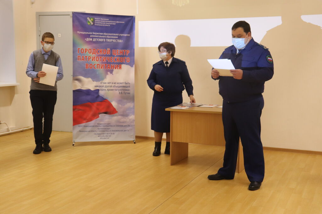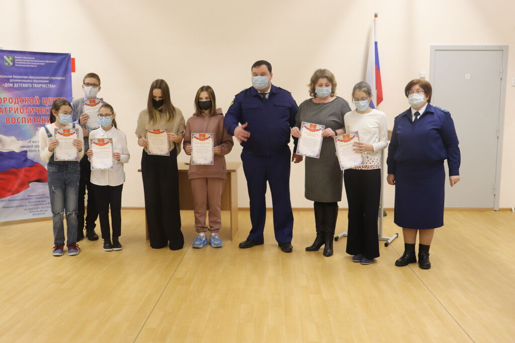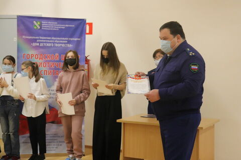 18 участников из 6 образовательный учреждений представили свои работы. Поблагодарил участников конкурса прокурор города, старший советник юстиции Тихомиров Сергей Александрович. Сергей Александрович не только вручил детям благодарности за участие в конкурсе, но и провел для ребят экскурс по истории прокуратуры.