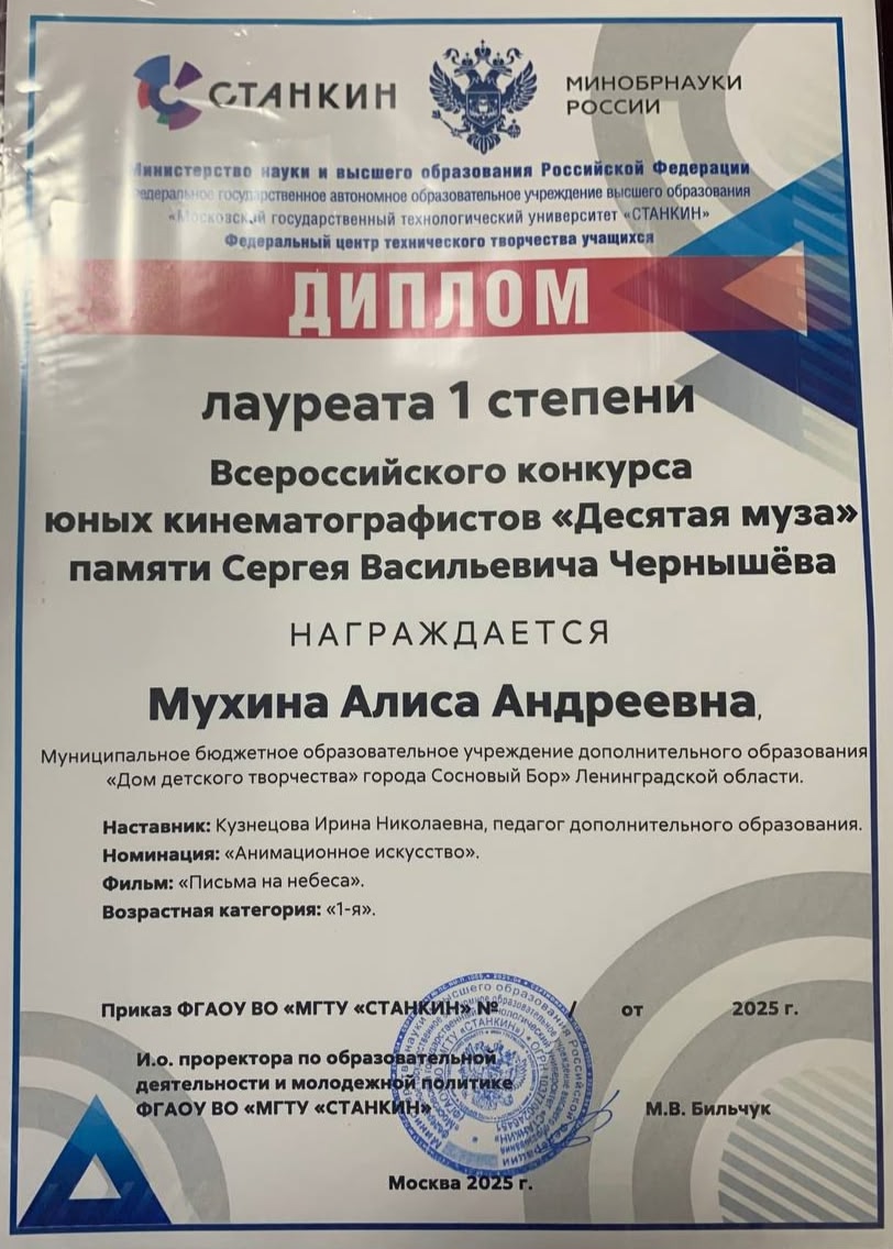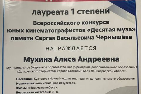 Наши ребята из детского объединения "Мультстудия "Весёлый лучик" (педагог Кузнецова Ирина Николаевна) представили Ленинградскую область на этом конкурсе, заняв первые места в номинации "Анимационное искусство" в двух возрастных категориях. Мухина Алиса (мультфильм "Письма на небеса") в возрастной категории 10-13 лет и Мамадалиев Владимир (мультфильм "Сквозь пламя. История одного подвига"), категория 14-17 лет