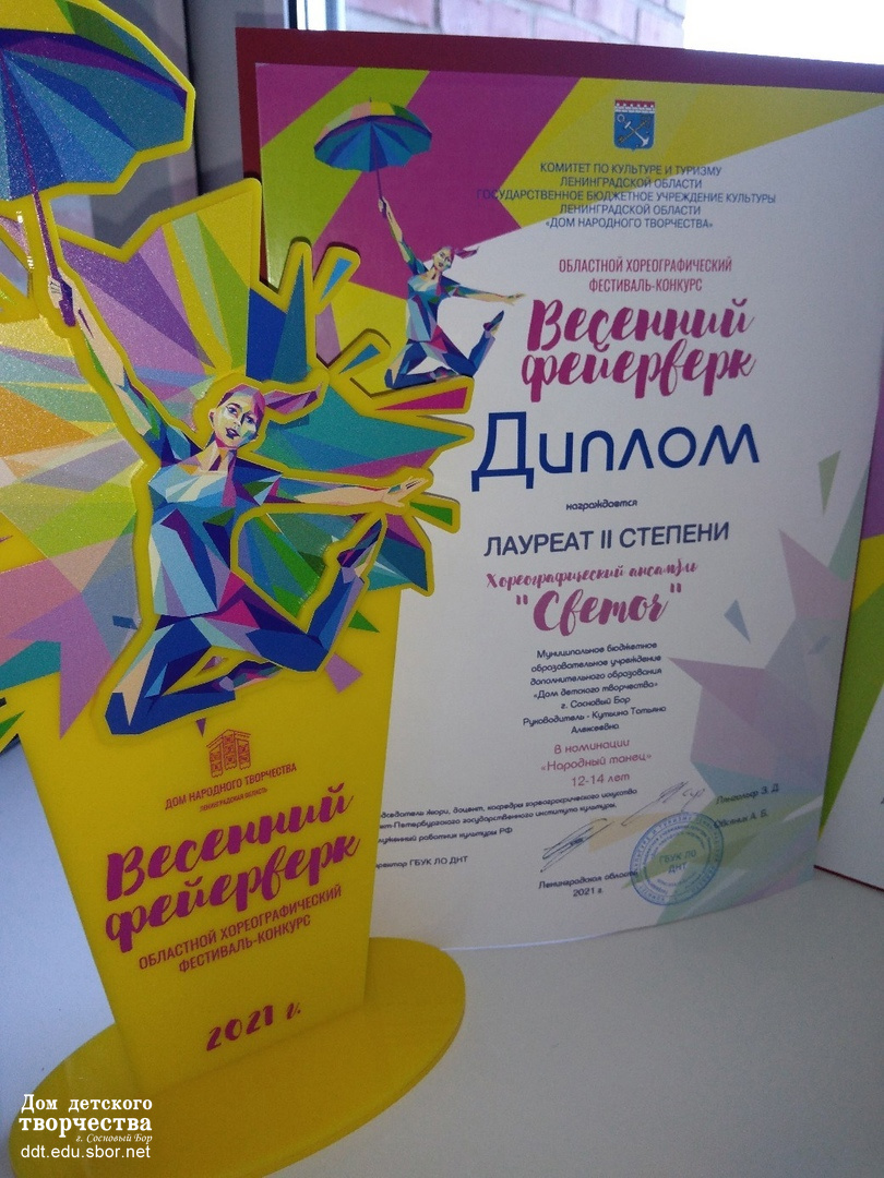 18 апреля были подведены итоги Областного хореографического фестиваля-конкурса "Весенний фейерверк" в г. Санкт-Петербург, который состоялся 10 апреля. В конкурсе приняли участие обучающиеся хореографического ансамбля «Светоч» (педагог: Кутьина Татьяна Алексеевна).