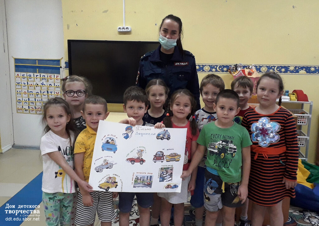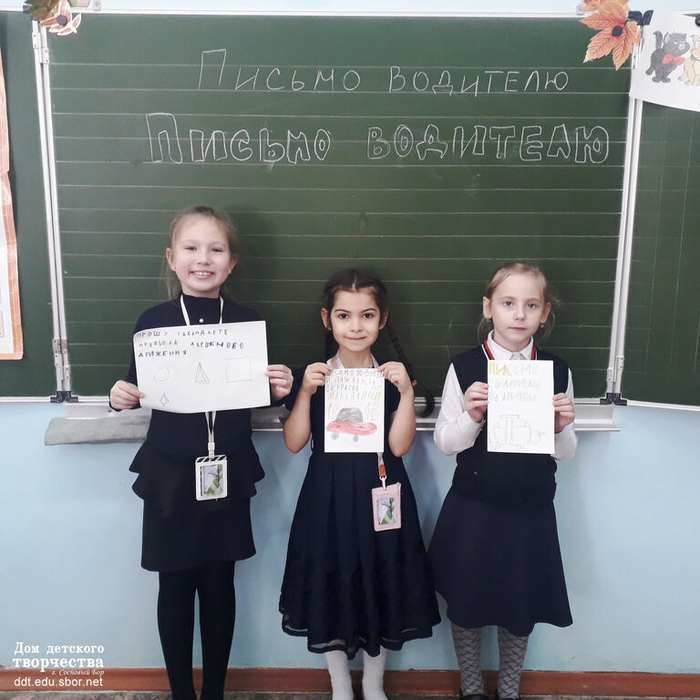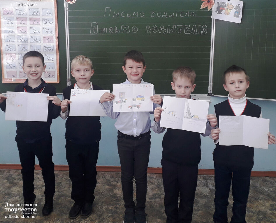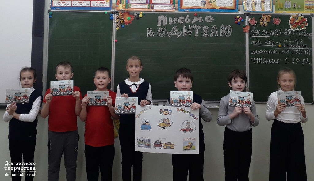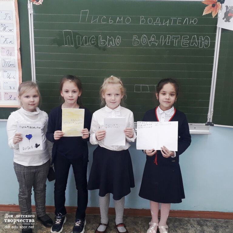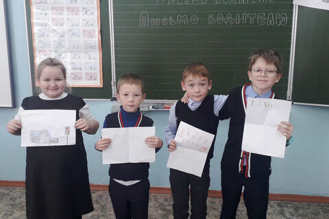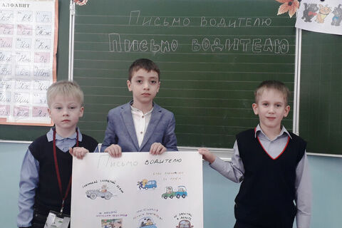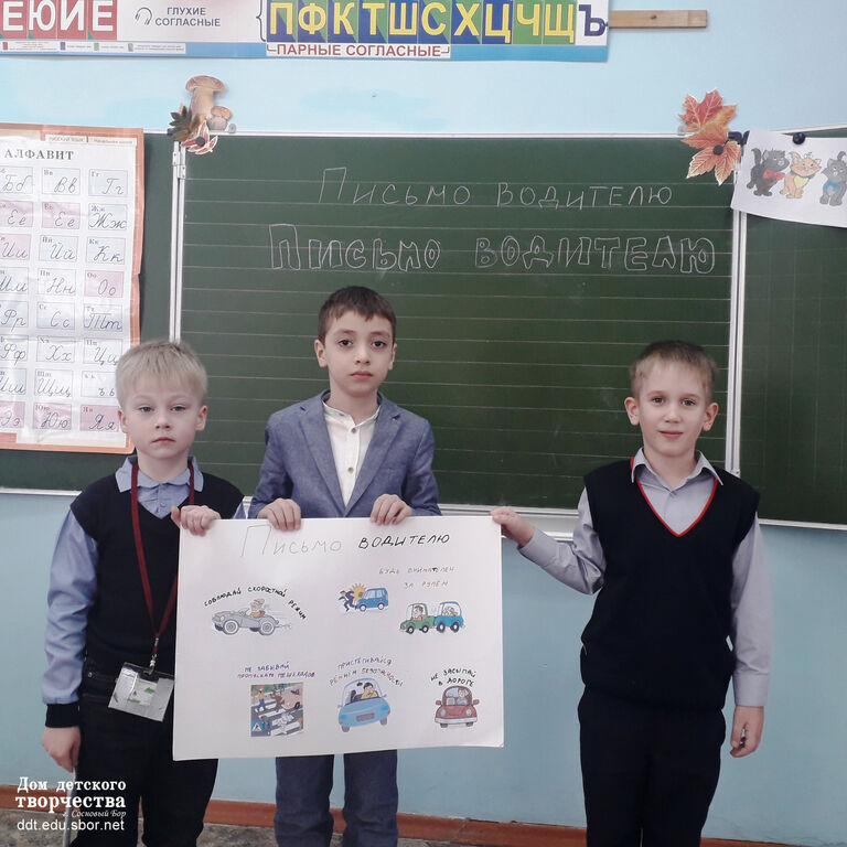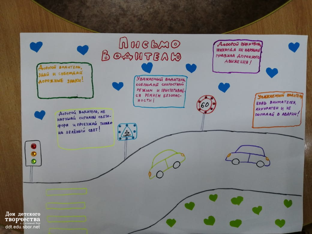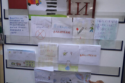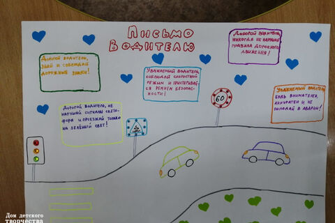 Совместно с педагогом Дома детского творчества Копыловой Марией Андреевной и инспектором по пропаганде безопасности дорожного движения дети изготавливали стенгазеты с обращениями к водителям, а также писали письма с пожеланиями по безопасности. Стенгазеты размещались в местах, доступных для изучения родителями, а написанные письма дети вручили своим знакомым водителям.