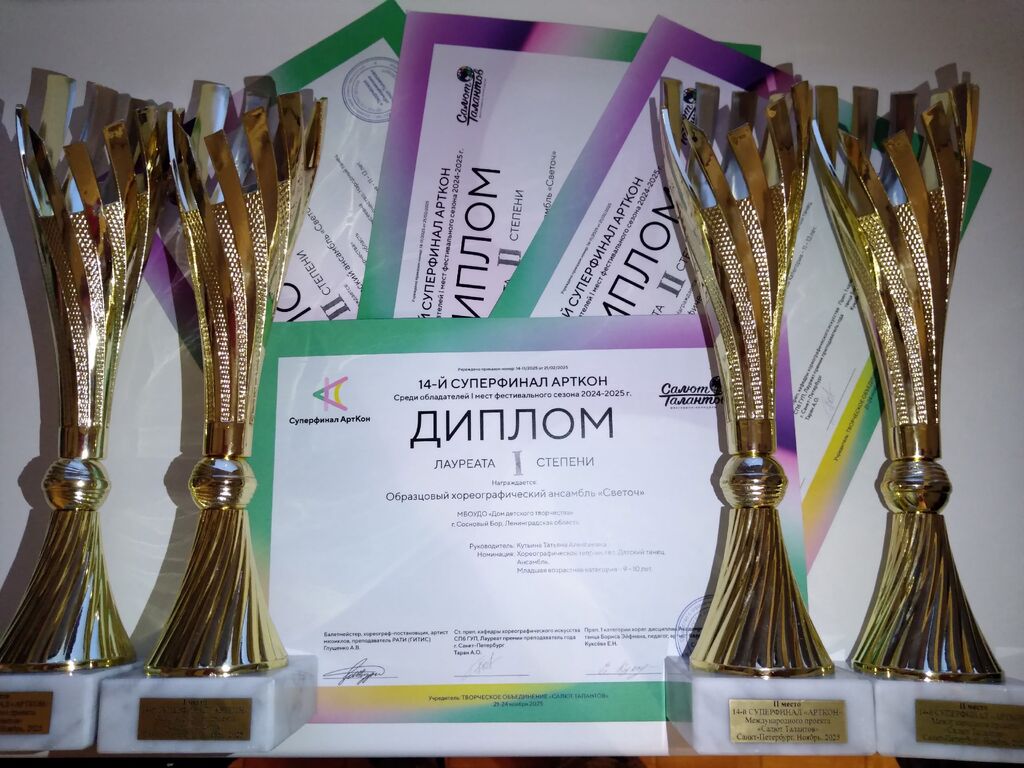 22 ноября образцовый хореографический ансамбль СВЕТОЧ по руководством Кутьиной Татьяны Алексеевны стал лауреатом 1 и 2 степеней в номинациях: народный, эстрадный и детский танец, возрастные категории 9-10,11-13 лет в Международныом конкурсе 14-й СУПЕРФИНАЛА АРТКОН среди обладателей 1 мест фестивального сезона 2024-2025г, который проходил в г. Санкт-Петербуге одновременно на 6 площадках.