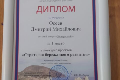 Воспитанник детского объединения «Юный предприниматель», педагог: Попова Дина Васильевна, Осеев Дмитрий стал Победителем Всероссийского конкурса «Стратегия Бережливого Развития», который проходил, в МДЦ «Артек», лагерь «Кипарисный» на сцене дворца Суук-Су в рамках Фестиваля детского творчества «Городе Мастеров». Дима представил проект «КНИГОВОРОТ»
