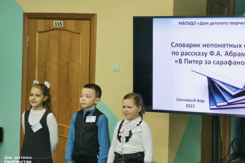 Тема исследования: "Словарик непонятных слов по рассказу Ф. А. Абрамова "В Питер за сарафаном". Распечатанный словарик ребята подарили Библиотеке семейного чтения. Все желающие могут почитать его там.