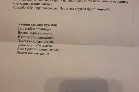 Учащиеся школ №1, 3, 7 и 9 написали письма ребятам, которые проходят срочную службу в рядах Российской армии. Учащиеся с большим желанием откликнулись на участие в акции. Каждому защитнику, чей адрес был получен в рамках проведения акции, были отправлены конверты с письмами, рисунками и самодельными открытками. Дети рассказывали о новостях школьной жизни, о том, какие изменения происходят в городе, поздравили с Днем Защитника Отечества. Теплый дружеский привет из родного города, школы - приятный и неожиданный подарок.