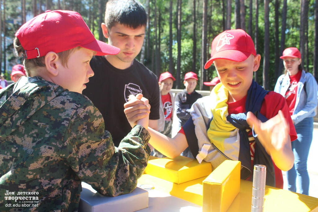 4 день. В гости к юнармейцам приехали гости из Санкт-Петербурга, из подростково-молодежного клуба "Мужество". В рамках проекта "Юнармия в профессии" представитель клуба Олеся рассказала ребятам о Михайловской военной артиллеристской академии: кто там учится, какие получают специальности, как туда поступить. А затем курсант первого курса академии, чемпион России по армреслингу Кокаев Александр и курсант третьего курса академии, чемпион мира по армреслингу Плиев Батрадз рассказали ребятам основные правила и приемы этого вида спорта. И юнармейцы не только попробовали себя в деле, но и выявили чемпионов ПОЛ "Юнармия" по армреслингу. По накалу страстей это было незабываемо, команды поддерживали друг друга.