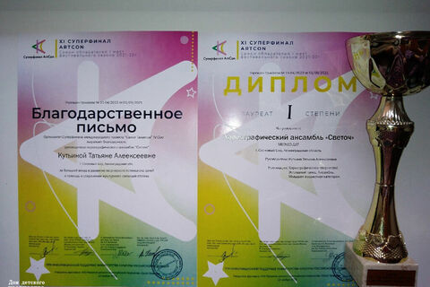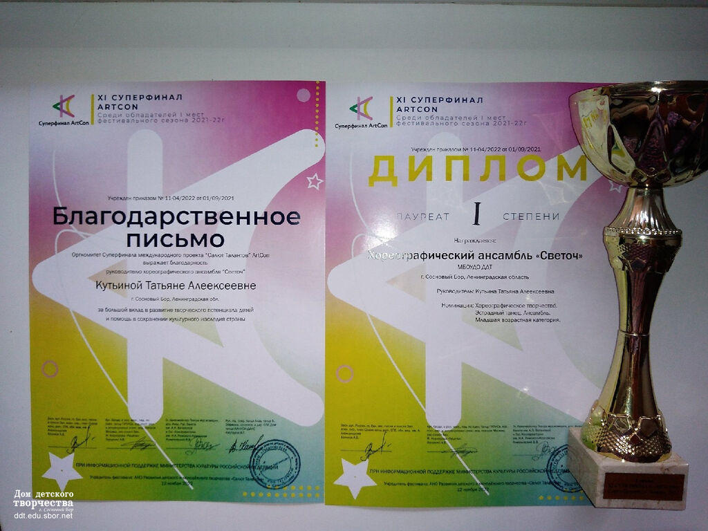 12 ноября хореографический ансамбль "Светоч" (педагог: Татьяна Алексеевна Кутьина) принял участие в XI СУПЕРФИНАЛЕ Международного проекта "САЛЮТ ТАЛАНТОВ" "ArtCon" фестивального сезона 2021–2022 г.в Санкт-Петербурге. В конкурсе приняли участие 49 городов и населенных пунктов, 800 участников - настоящий СУПЕРФИНАЛ! Прекрасные впечатления, эмоции получили дети и Татьяна Алексеевна от этого конкурса.