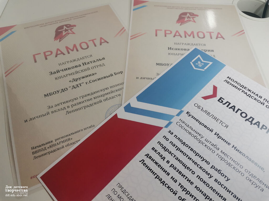 26 ноября Кузнецова Ирина Николаевна, методист, начальник штаба местного отделения ВВПОД "Юнармия", посетила V Внеочередной Слет регионального отделения ВВПОД "Юнармия" Ленинградской области в городе Санкт-Петербург, где была награждена благодарностью Комитета по молодежной политике Ленинградской области. так же благодарностями были отмечены юнармейцы отряда "Дружина" Зайчикова Наталья и Исакова Валерия.