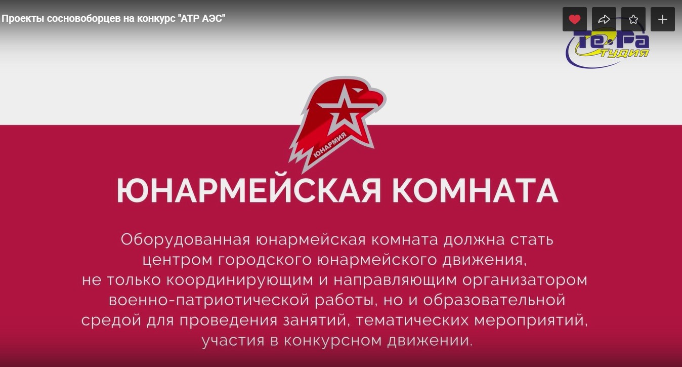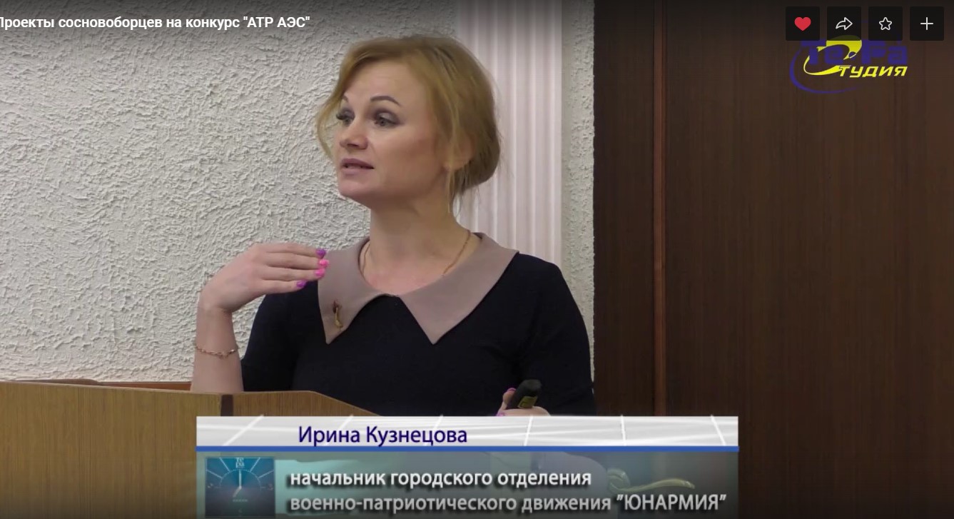 26 января состоялась защита социально значимых проектов на соискание Гранта Фонда "АТР АЭС". Дом детского творчества с проектом "Создание юнармейской комнаты местного отделения ВВПОД "Юнармия" представляла начальник местного отделения, методист ДДТ Кузнецова Ирина Николаевна.
