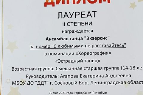 - Диплом Лауреата I степени – хореографический ансамбль «Экзерсис» (возрастная группа 14-18 лет),
