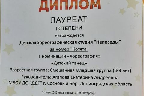 - Диплом Лауреата I степени – хореографический ансамбль «Непоседы» (возрастная группа 3-9 лет),