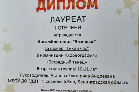 - Диплом Лауреата I степени – хореографический ансамбль «Экзерсис» (возрастная группа 10-11 лет),