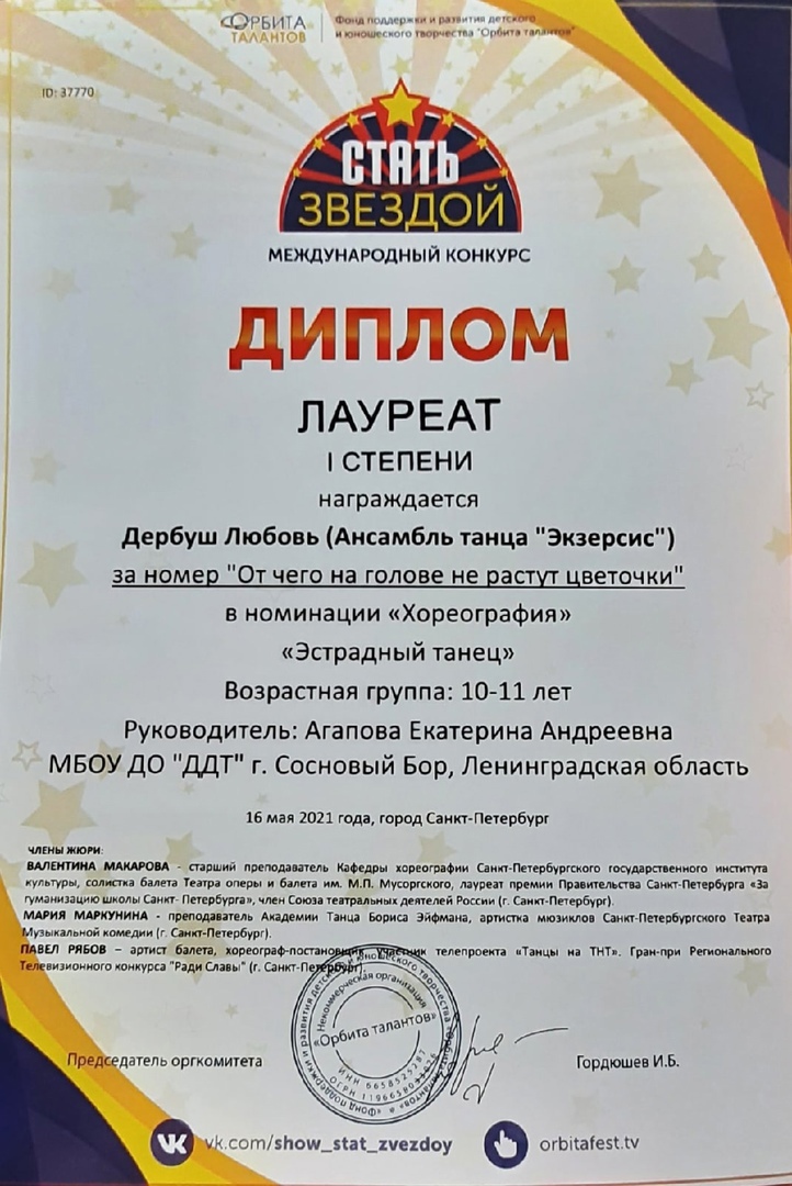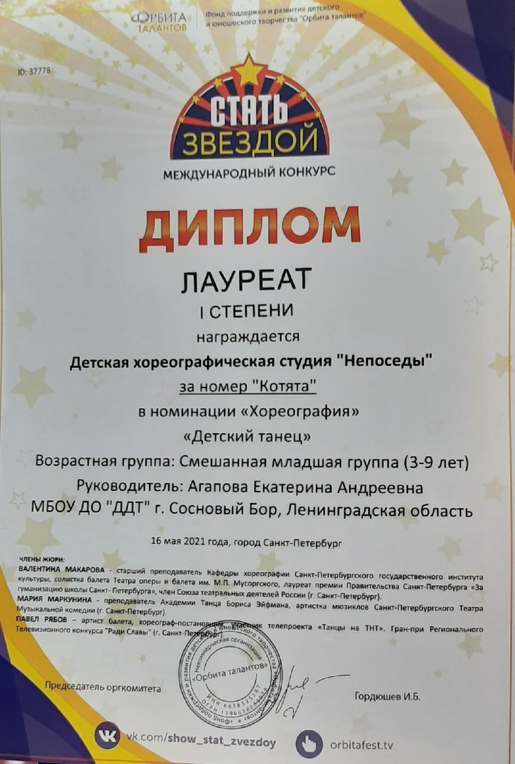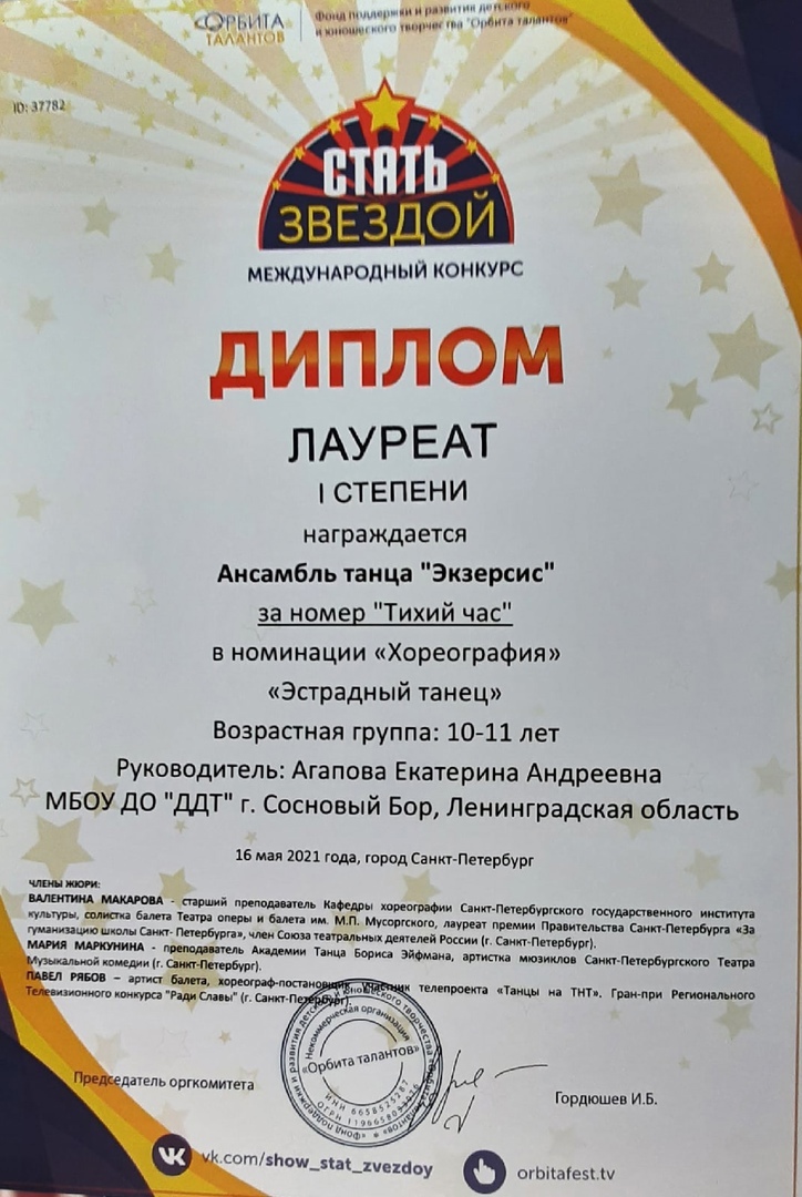 16 мая обучающиеся хореографического ансамбля «Экзерсис», «Непоседы» (педагог: Агапова Екатерина Андреевна) приняли участие в Международном многожанровом конкурсе-фестивале детского, юношеского и взрослого творчества «Стань Звездой» г. Санкт – Петербург.