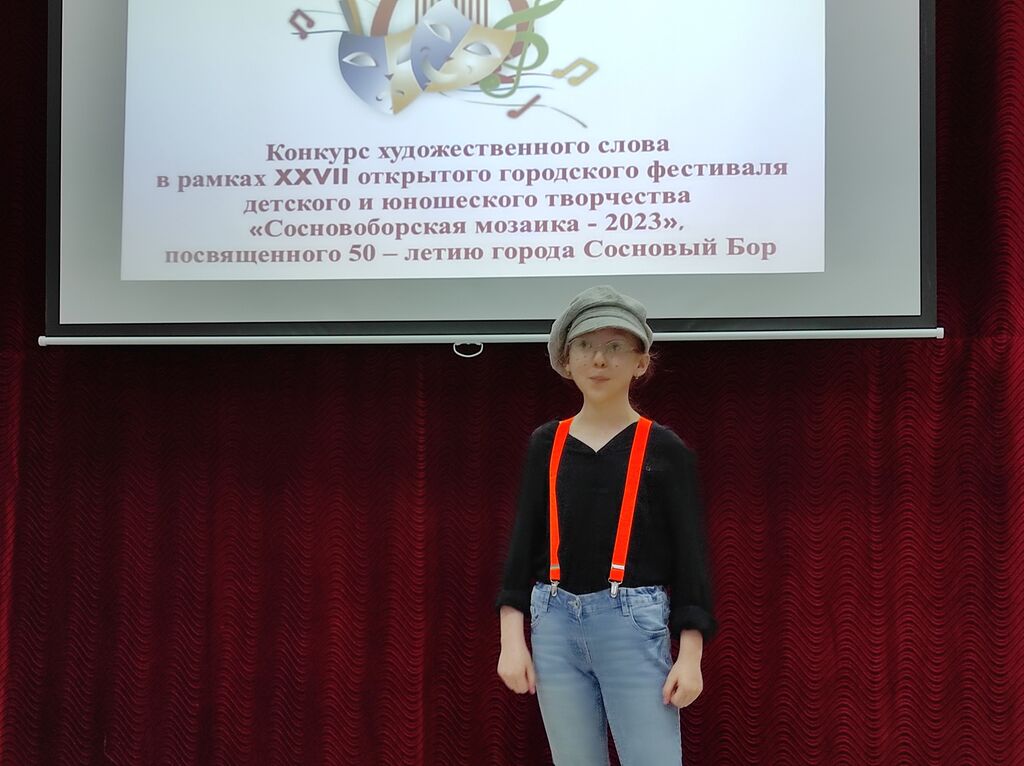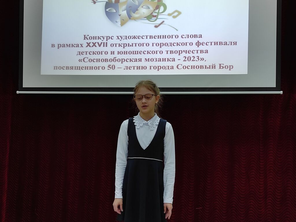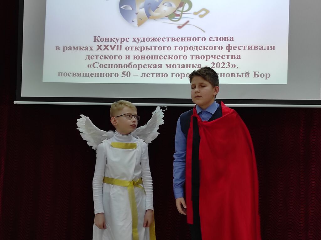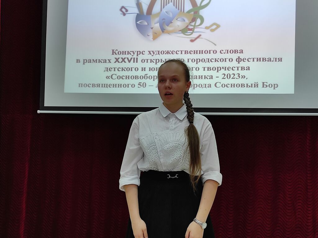 16 - 17 февраля в Доме детского творчества прошел Конкурс художественного слова «Театр и мы» в рамках XXVII городского открытого фестиваля детского и юношеского творчества «Сосновоборская мозаика - 2023», посвященного 50-летию города Сосновый Бор. Тема фестиваля: «Славься, наш любимый город, славься творчеством детей!»