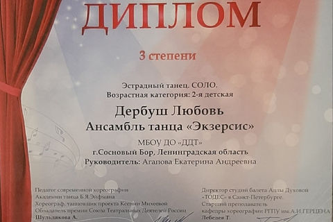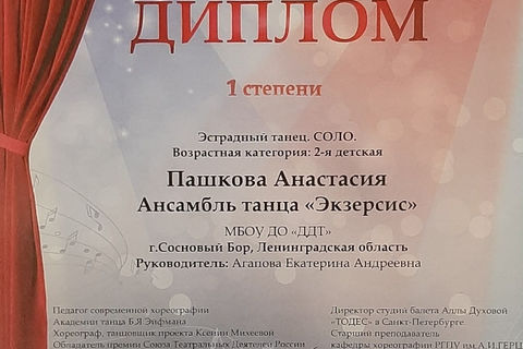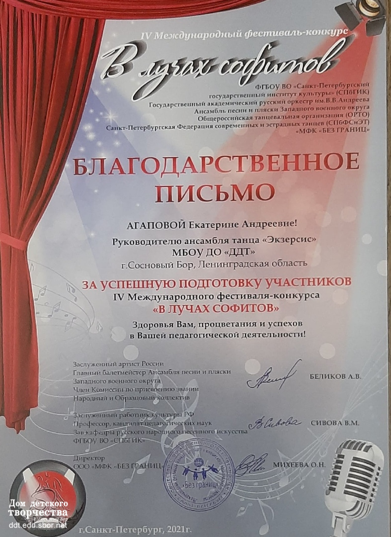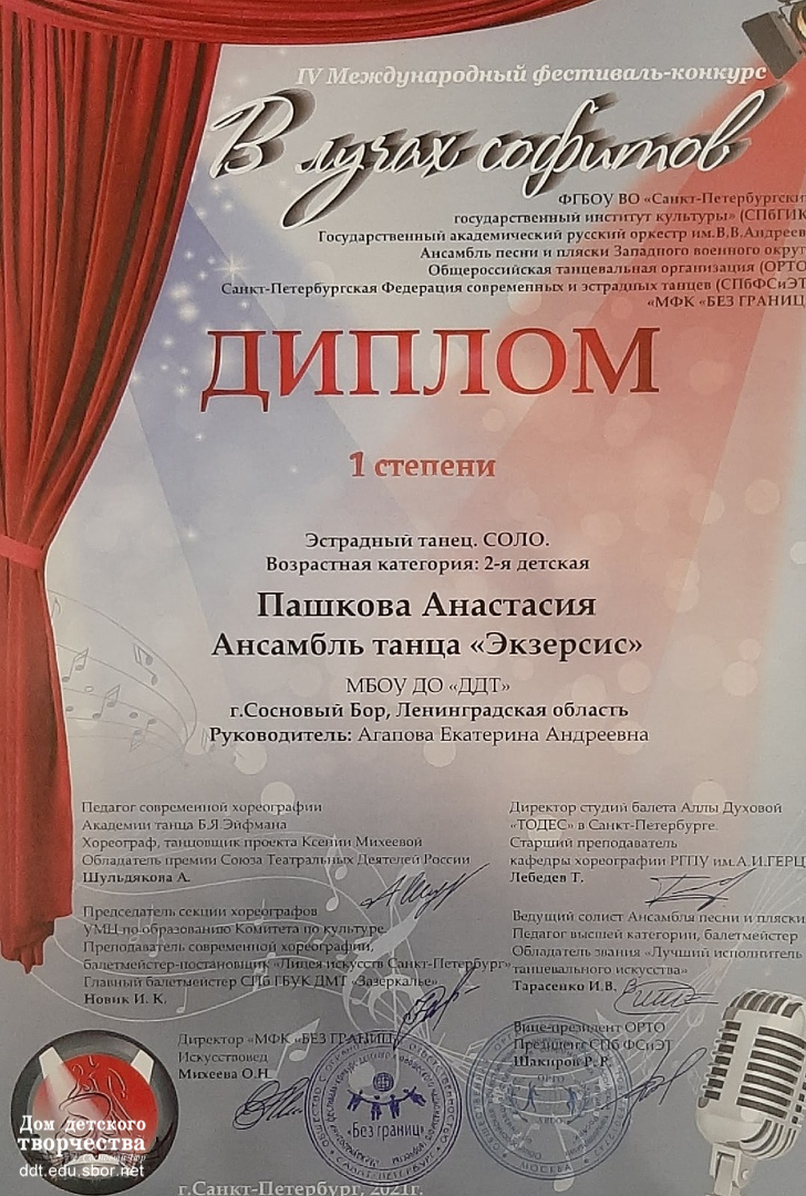 26 марта хореографический ансамбль "Экзерсис" , педагог Агапова Екатерина Андреевна, приняли участие в IV Международном фестивале-конкурсе «В ЛУЧАХ СОФИТОВ», г. Санкт-Петербург.