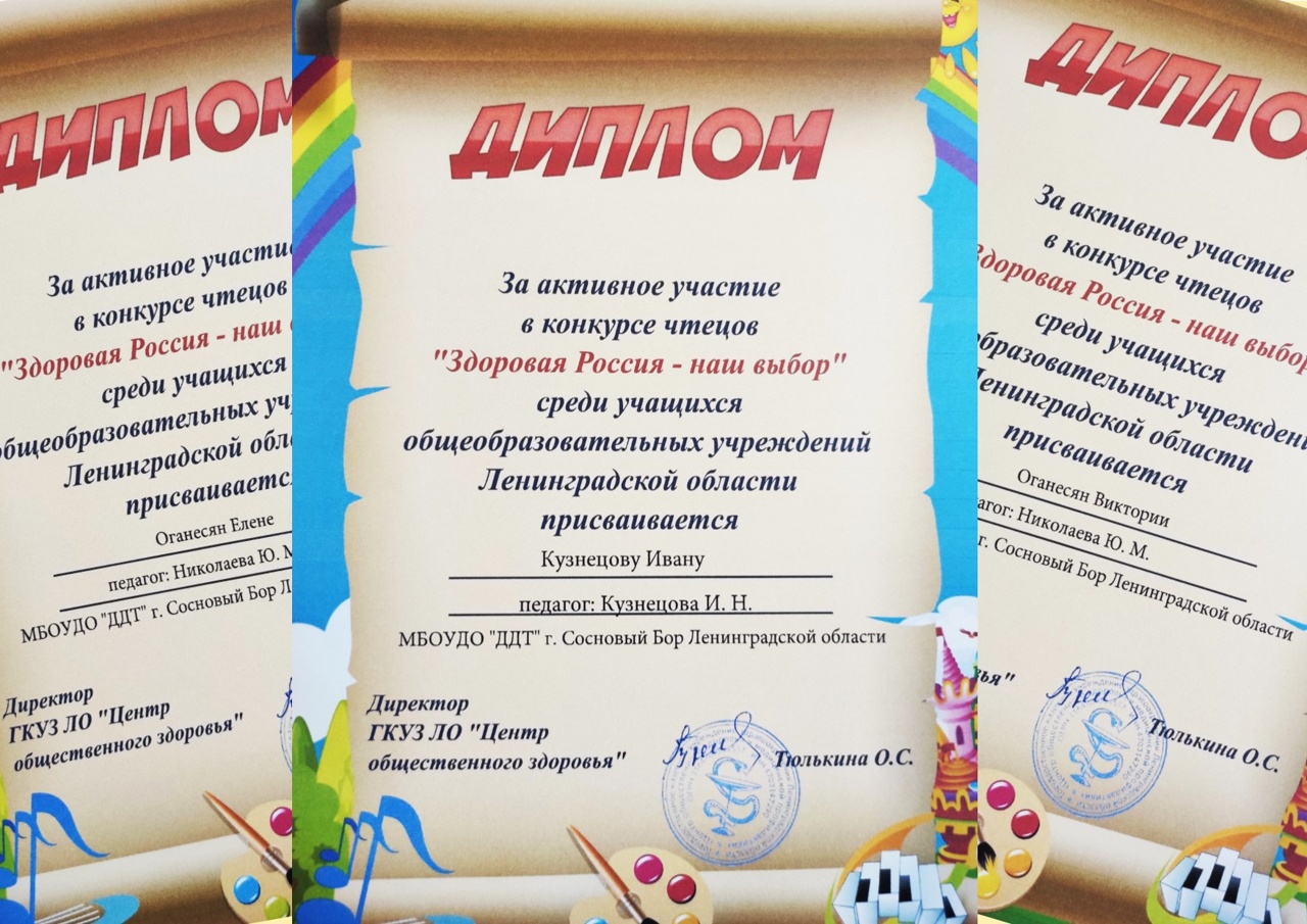 C 20 апреля по 23 мая обучающиеся детских объединений "Мультстудия "Веселый лучик" (педагог: Кузнецова Ирина Николаевна), "МАИ" (педагог: Николаева Юлия Михайловна) приняли участие в конкурсе стихов "Здоровая Россия - наш выбор" среди учащихся общеобразовательных учреждений Ленинградской области, организатор конкурса Комитет по здравоохранению Ленинградской области, ГКУЗ ЛО "Центр общественного здоровья", ГАОУ ДПО "Ленинградский областной институт развития образования".