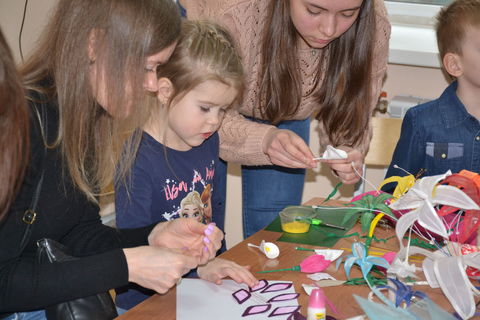 А для тех, кто прыгать не хотел, в холле были организованы мастер-классы. А так как семейный выходной весенний, то и поделки были весенние. Самые маленькие ребята сделали солнышко, а ребята постарше - цветы. Так получилось, что в этот раз подключились родители и с удовольствием делали цветы вместе со своими малышами. Кому это занятие понравилось больше, еще большой вопрос.